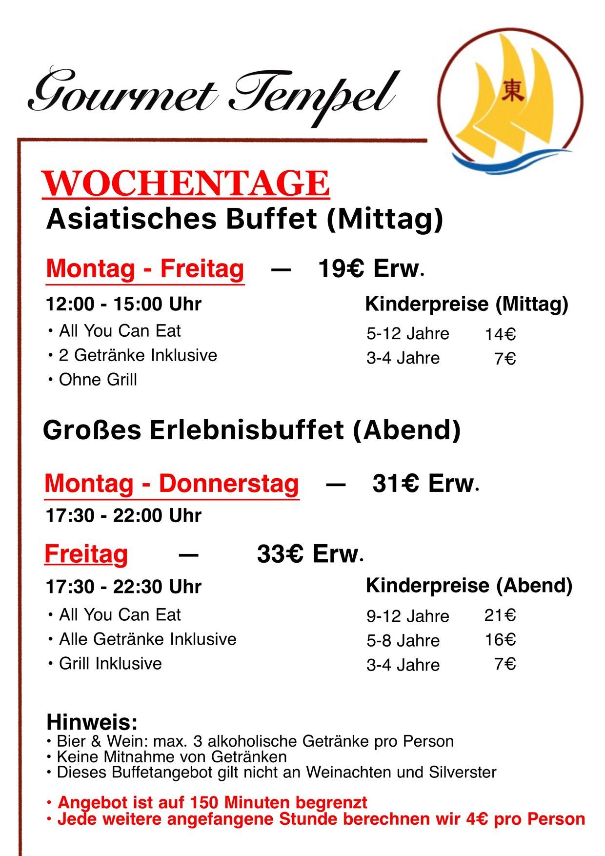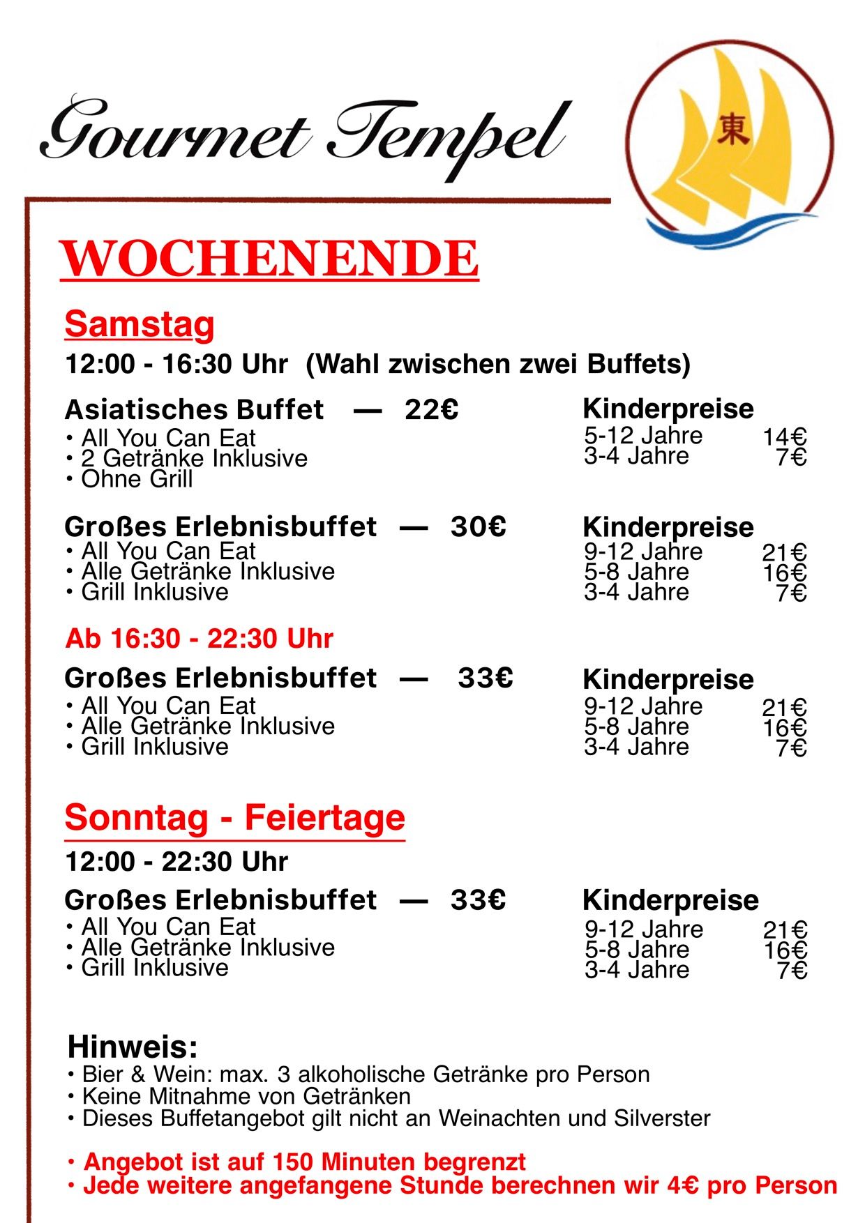 Bitte beachten Sie, dass die Buffet-Angebote auf 2,5 Stunden begrenzt sind!